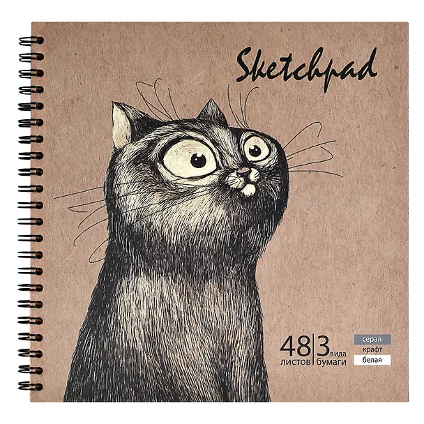 Скетчбук 195*195 48л "СМЕШНЫЕ ЖИВОТНЫЕ" тв.переплёт, гребень, бел.офсет, крафт-бумага, серый офсет