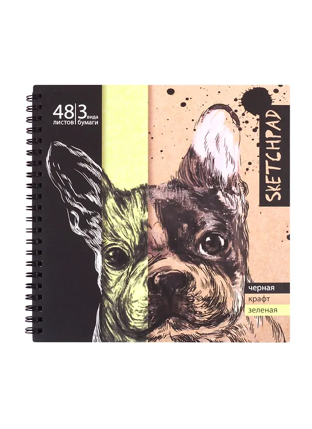 Скетчбук 195*195 48л "Животные" чёрная, зелёная, крафт. бумага 120 г/м2, 80 г/м2, карт.обл., гребень
