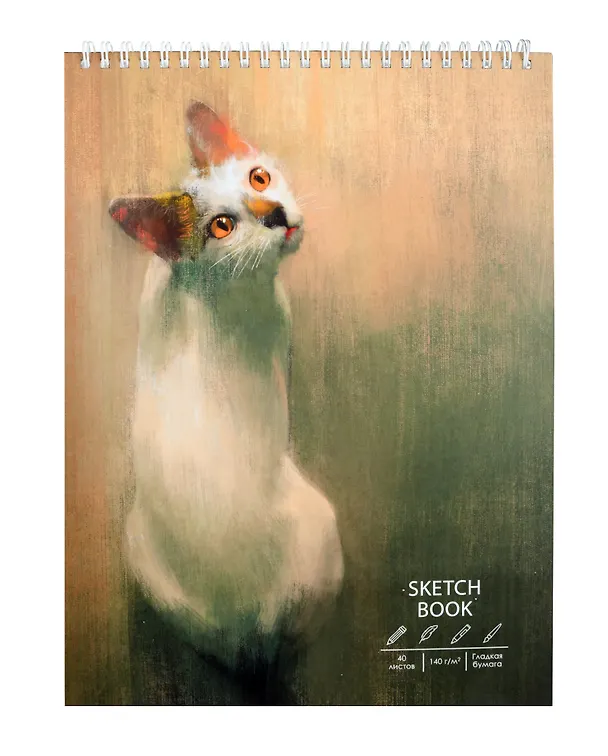 Хороший болшой скетчбук - обратите внимание на формат А4 - достаточно, чтобы написовать полноценную картину. Бумага белая, плотная. Обложка хорошеьнкая, милая - с забавный котиком. Такой скетчбуг подойдет для акварели и для карандашей, также можно рисовать тушью. В целом все хорошо.