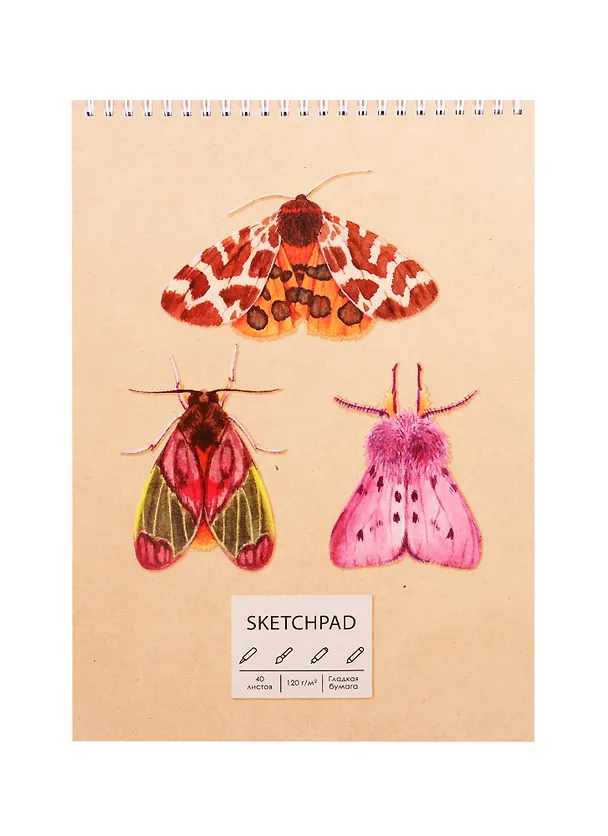 Мне очень нравится этот скетчбук. Большой по размеру, обложка твердая, с изображением красивых мотыльков, которое может подарить вдохновение или поднять настроение обладателю скетчбука. Обложка частично глянцевая (а именно изображения). Листы на спирали. Бумага плотная, белая, на ней комфортно рисовать, годится для создания всевозможных рисунков/эскизов/скетчей.