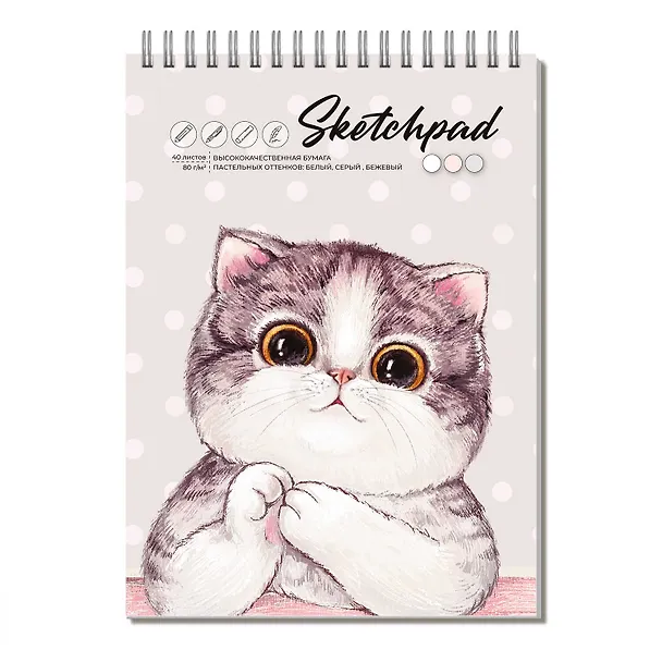Скетчбук А5 40л "Милая кошка" белая, серая, бежевая бумага 80г/м2, тв.обложка, гребень.