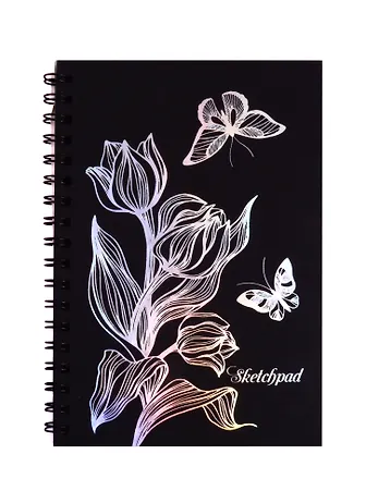 Скетчбук A6 30л "Цветы" черный блокнот с черными листами 120г/м2, картонная обложка, твердая подложка, гребень - это отличный выбор для любителей творчества. Дизайн обложки выигрышен, вдохновляет и мотивирует на рисование. Скетчбук имеет удобный размер, который позволяет брать его с собой везде и легко помещается в сумку или рюкзак.