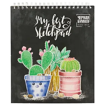 Скетчпад 168*195, 30 листов, черная бумага арт. 49133/5 КАКТУСЫ /168*195 мм, блок - черная тонир/ бумага 120 г, 30 листов, обложка - полноцвет, картон 190 г, подложка - твердый картон. Гребень по короткой стороне/