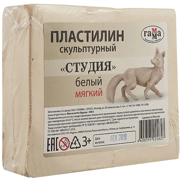 Скульптурный мягкий пластилин ГАММА серии «Студия» белого цвета. Прекрасно держит форму и устойчив к перепадам температуры, не оставляет пятен и не липнет к рукам. Не токсичен: не содержит серу, без выраженного химического запаха. Скульптурный пластилин ГАММА помещён в вакуумную упаковку. Вес бруска — 500 г.
