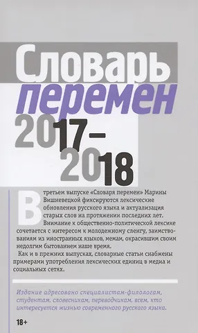 «Словарь перемен 2017-2018» - третья книга Марины Вишневецкой в цикле блицеловарей, фиксирующих лексические обновления русского языка и актуализацию старых слов на протяжении последних лет. Серия продолжает традицию лексикографических изданий «Трех квадратов», заложенную книгой Г. fy-сейнова «Д.С.П. Материалы к словарю русского общественно-политического языка XX века (2003)».