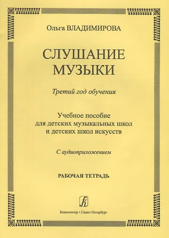 Рабочая тетрадь к пособию «Слушание музыки» (третий год обучения). Здесь дублируются наиболее важные сведения из материалов уроков для запоминания, составлены домашние задания, которые выполняются учениками в самой рабочей тетради. Весь материал представлен в виде таблиц и схем, в которых оставлены пустые места для ответов, есть нотные станы для творческих сочинений. Достоинство тетради — в ее максимальной слитности с учебником; в то же время подробно выписанные задания и темы уроков позволяют использовать ее в качестве дополнительного пособия к любому предмету (будь то сольфеджио или музыкальная литература).