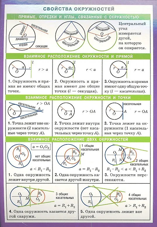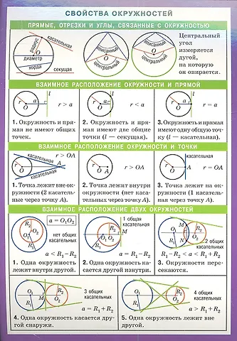 Справочные материалы содержат "Свойства окружностей, взаимное расположение окружностей и точек, а также прямой. Свойства углов, связанных с окружностью и метрическое соотношение в окружности". Основная задача наглядного пособия - закрепить и частично расширить сведения, полученные школьниками на уроках математики. Сжатые теоретические сведения, рисунки, ключевые формулы помогут школьникам быстро сориентироваться в материале,