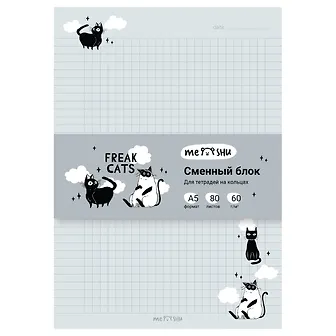 Сменный блок для тетрадей Freak cats от MESHU — отличное решение для тех, кто предпочитает удобную и оригинальную канцелярию. Листы подходят для учёбы, повседневных записей, планирования дел и творческих заметок. Блок совместим со стандартными тетрадями формата A5, оснащёнными кольцевым механизмом. Цветной дизайнерский блок с забавным оформлением превратит обычный конспект в яркие привлекательные записи. Каждый лист дополнен полем для даты. Разметка в клетку с полями позволяет вести записи аккуратно. Бумага голубого оттенка имеет плотность 60 г/м². Листы скреплены стрип-лентой и упакованы в термоусадочную плёнку для аккуратного хранения. Сменный блок позволяет регулировать объём записей, доп