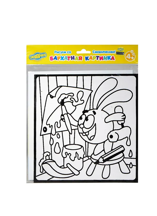 Сочетание разноцветных красок и чёрного бархата создаёт неповторимый цветовой эффект. Бархатная поверхность помогает ребёнку аккуратно выполнить работу. Рисунок с героями любимого мультсериала «Смешарики».