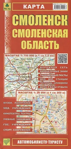 Подробная карта Смоленской области с указанием класса дорог и расстояний между населенными пунктами в километрах. Указано расположение постов ГИБДД, автозаправочных станций, гостиниц и домов отдыха. Имеется указатель населенных пунктов. Масштаб 1:750000. Кроме этого карта содержит подробный план города со всеми улицами, номерами угловых домов. Указано расположение административных зданий и социально-культурных объектов. Имеется указатель улиц. Масштаб 1:26 000
