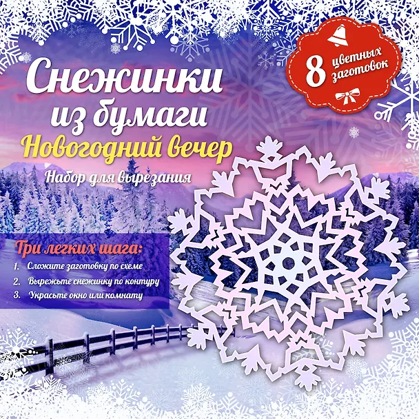 В комплекте вы найдете восемь цветных листов-заготовок с уже нанесенной разметкой контура для вырезания ажурных снежинок. Вам нужно все лишь сложить лист-заготовку по приведенной на упаковке схеме и затем вырезать ножницами снежинку по линиям.