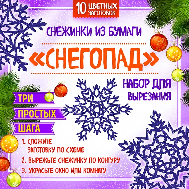 Снежинками можно украсить окно, зеркало, елку, открытку, использовать для сервировки праздничного стола или в качестве дополнения к упаковке новогоднего подарка. В комплекте вы найдете десять цветных листов-заготовок с уже нанесенной разметкой контура для вырезания ажурных снежинок. Вам нужно всего лишь сложить лист-заготовку по приведенной на  упаковке схеме и затем вырезать ножницами снежинку по линиям.