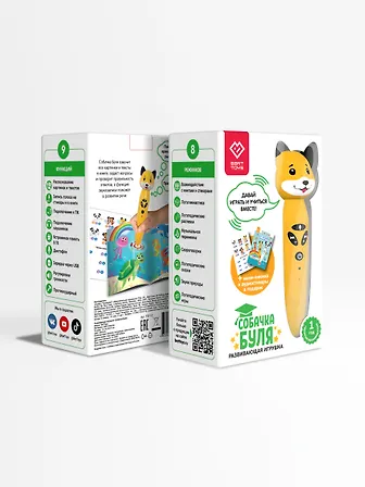 В комплекте: мини-книга и многоразовые аудиостикеры, которые клеятся на разные поверхности и озвучиваются смарт-игрушкой.