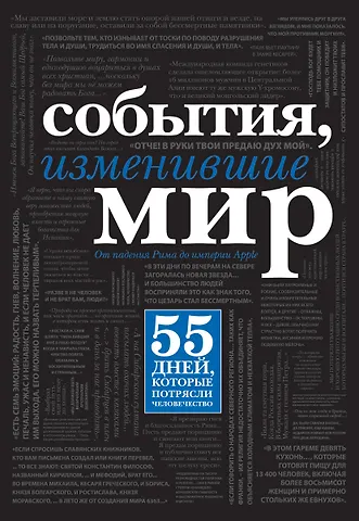 События изменившие мир От падения Рима до империи Apple. Очень интересная энциклопедия сама по себе, и конечно же отличный подарок. Увидела ее в магазине, настолько понравилась, что решила купить. Теперь дома изучаем всей семьей. Все это конечно можно и в интернете найти, но я предпочитаю бумажный вариант.