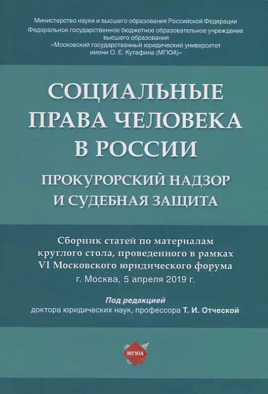 В сборник вошли статьи участников круглого стола «Социальные права человека в России: прокурорский надзор и судебная защита». Круглый стол был организован кафедрой организации судебной и прокурорско-следственной деятельности Университета имени О.Е. Кутафина (МГЮА) 5 апреля 2019 г. в рамках Кутафинских чтений.