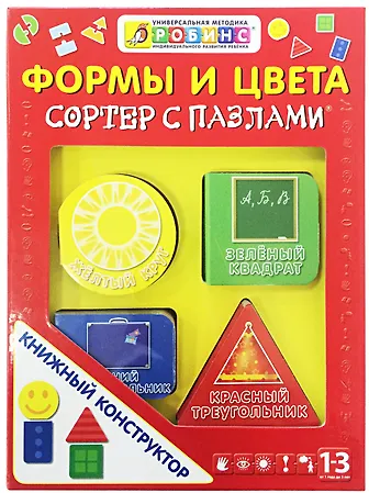 Это набор удивительных развивающих книжек-форм и пазлов, которые все вместе работают как развивающие игрушки - конструктор и сортер. В наборе-сортере вы найдете 4 книжки-формы (круг, квадрат, треугольник и прямоугольник) и соответствующие им углубления, а также 16 деталей-пазлов, которые собираются в геометрически формы, соответствующие форме книги или повторяющие иллюстрации в ней. Задняя сторонка каждой книги запечатана специальным графическим элементом, так чтобы соединив две книжки вместе, вы могли получить фигурку мальчика, девочки, домика, мороженого и пр. фигурки, примеры которых даются на коробке.