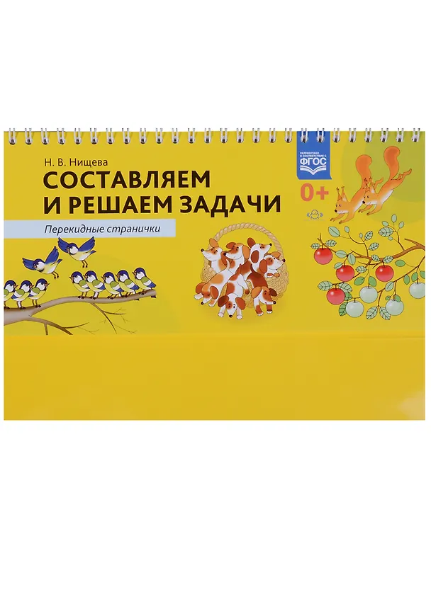 На перекидной страничке слева расположен рисунок, по которому ребенок должен составить условие задачи. Например, в аквариуме плавало семь рыбок, двух рыбок поймали сачком. Сколько рыбок осталось в аквариуме? Далее ребенок составляет решение задачи. Его можно записать или выложить из цифр и знаков на карточках или кубиках: 7 - 2 = 5. И наконец, ребенок находит среди перекидных страничек справа нужную цифру или нужное число - ответ на вопрос задачи.