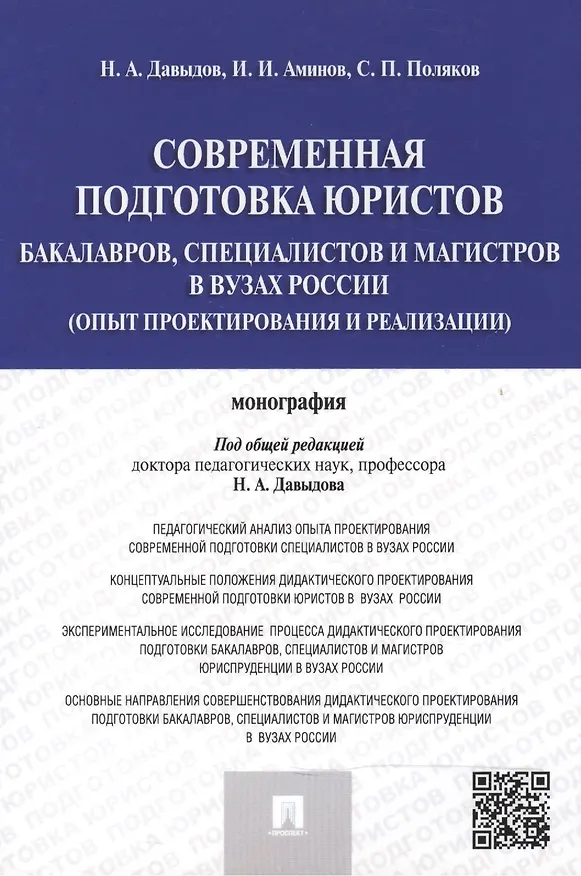 Монография посвящена актуальной проблеме высшей школы дидактическому проектированию и реализации подготовки юристов с различным уровнем высшего профессионального образования, обобщен опыт подготовки бакалавров и магистров юриспруденции в вузах России. На основе исследования педагогической теории и практики современной подготовки специалистов в работе анализируется современный опыт проектирования в юридических вузах, обосновывается сущность и содержание дидактического проектирования подготовки юристов: бакалавров, специалистов и магистров в высшей школе, раскрываются основные направления его совершенствования, предлагаются различные проекты подготовки юристов, представлен сравнительный анализ опыта подготовки юристов, психологов и экономистов в вузах. В монографии обоснованы возможности учета в современной подготовке юристов «компетентностного подхода» как при проектировании, так и при его реализации в юридических вузах России. Работа предназначена для руководителей вузов, для педагогов юридических вузов, а также для будущих юристов, активно занимающихся повышением уровня своей подготовленности к профессиональной деятельности. Материалы монографии целесообразно использовать преподавателям, проходящим подготовку по дополнительной специальности «Преподаватель высшей школы». . .