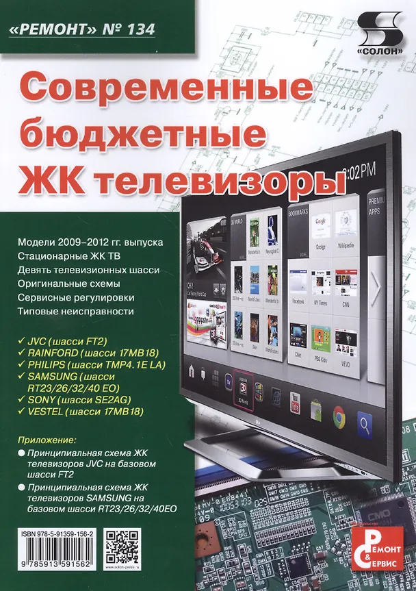 В очередной книге серии "Ремонт" описаны популярные модели современных жидкокристаллических телевизоров компаний JVC, RAINFORD, PHILIPS, SAMSUNG, SONY и VESTEL производства 2009-2012 гг.