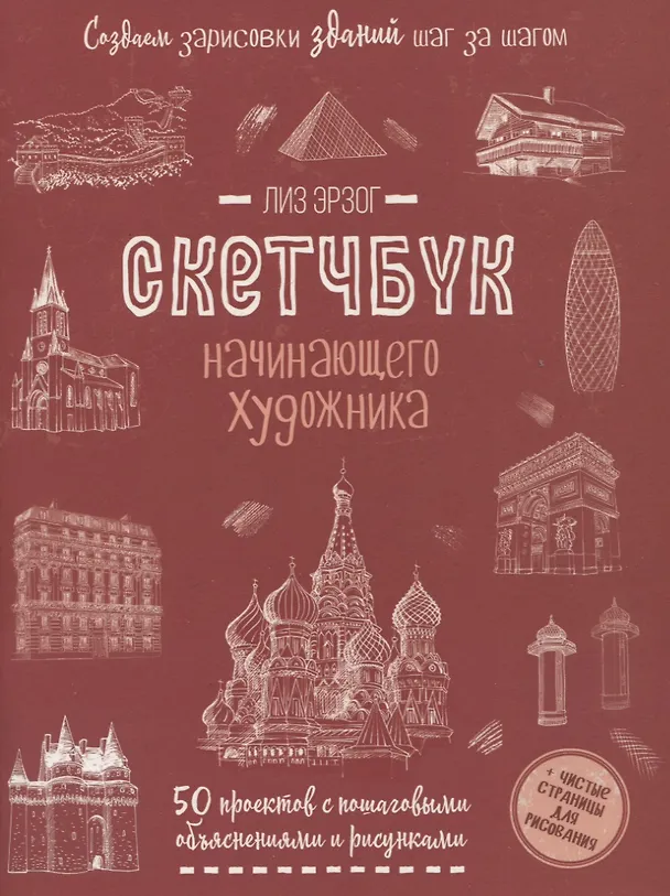 Серия «Скетчбук начинающего художника» от известного иллюстратора Лиз Эрзог воплотила в себе все достоинства современных учебников по рисованию: простоту, наглядность, возможность начать практиковаться прямо на страницах пособия, а также, что немаловажно, компактность и бюджетность. В каждом из этих скетчбуков вас ждет по 50 мастер-классов, выполненных и показанных пошагово и очень подробно. В этом скетчбуке вас ждут мастер-классы по рисованию зданий и построек: домов, дворцов, башен, пирамид, замков и т. д. Для простоты и наглядности автор разбивает каждое строение на простые формы и объемы, а затем с помощью различных приемов светотени и перспективы, а также разнообразных принадлежностей,