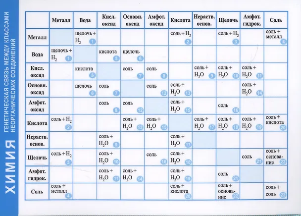 Маленькая табличка по взаимодействию разных классов неорганических веществ с одной стороны, с другой стороны приведены применять взаимодействий этих классов веществ между собой. Табличка заламинирована- что считаю большим достоинством! Не заляпается, не помнется и даже если прольете на неё жидкость, она сохранит свой вид. Удобный справочный материал в помощь школьнику.
