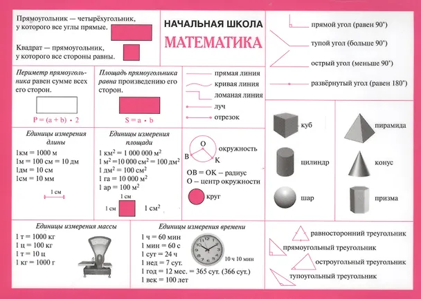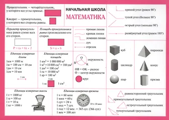 Перед вами справочный материал для начальной школы по математике. Материал удобно расположен, в цветных таблицах, с двух сторон на ламинированном листе.
