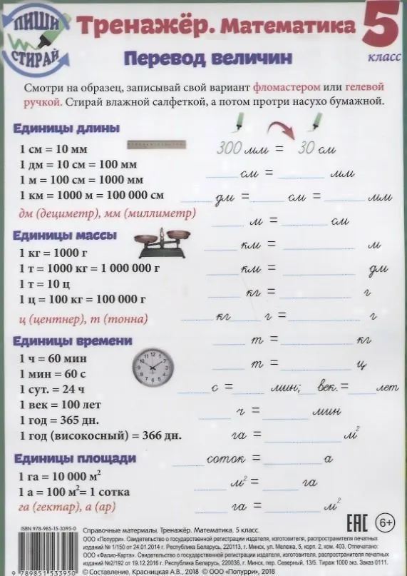 Справочные материалы Тренажер Математика 5 кл. Перевод величин… (Пиши стирай) (лист) (ламинир.)
