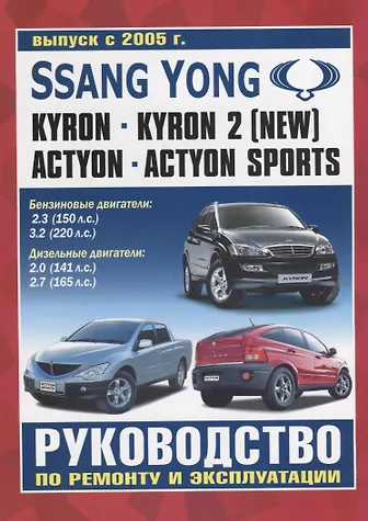 Ssang Yong. Kyron, Kyron 2 (New), Actyon, Actyon Sports. Выпуск с 2005 г. Руководство по ремонту и эксплуатации. Бензиновые двигатели: 2.3 (150 л.с.), 3.2 (220 л.с.). Дизельные двигатели: 2.0 (141 л.с.), 2.7 (165 л.с.)