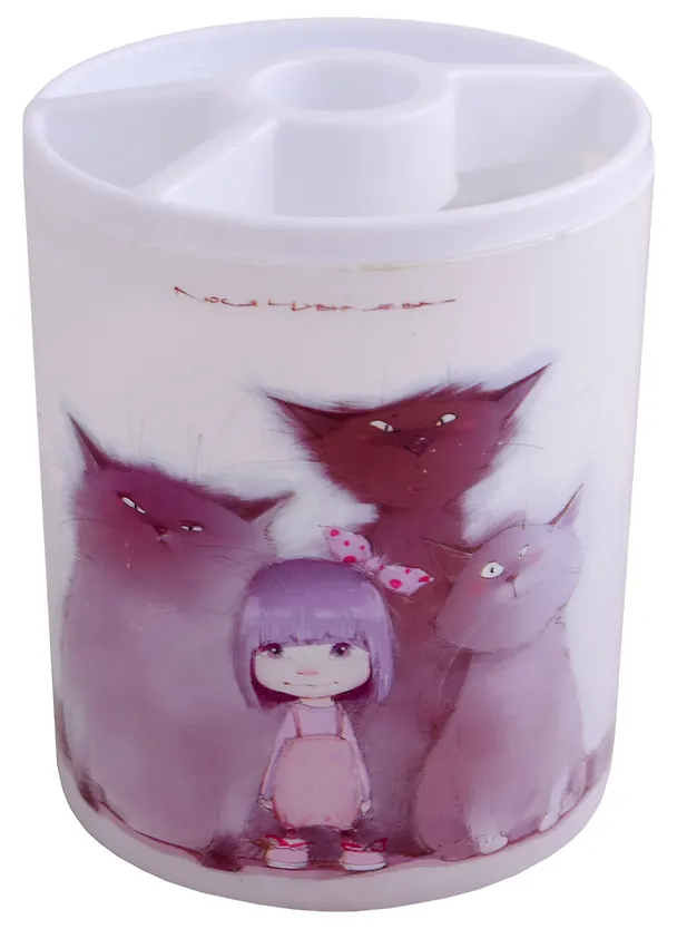 Очень хороший и удобный стакан для письменных принадлежностей с четырьмя разделителями наверху, что очень удобно - карандаши и ручки не смешиваются между собой. Стакан пластиковый, но пластик очень неплохого качества и на ощупь и по внешнему виду, нет неприятного запаха, нет заусенцев, нет наплавок и прочих неприятностей. А рисунок на стакане очень привлекательный, такой подойдёт и детям для школы и девушкам в офис. Всегда удобно, если канцелярия не разбросана по столу, а собрана в одном месте. В таком как этот стакан-органайзер. Вес небольшой, высота оптимальная, размер стандартный, на столе смотрится хорошо, стоит недорого. Покупкой довольны, изъянов нет.