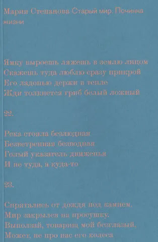 Мария Степанова родилась в 1972 году в Москве. Автор двенадцати поэтических книг, включая книги избранных стихотворений «Стихи и проза в одном томе» (2010) и «Против лирики» (2017), трех сборников эссе — «Один, не один, не я» (2014), «Три статьи по поводу» (2015), «Против нелюбви» (2018) — и романа «Памяти памяти» (2017).