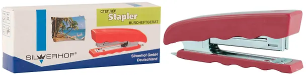 Степлер №10 16л "Elegance" пластиковый, красный, мет.антистеплер, к/к, Silwerhof