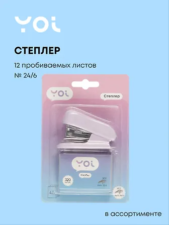 Степлер Yoi, со скобами, в ассортименте — удобный помощник для учёбы, работы и дома. Пластиковый корпус в нежных пастельных тонах комфортно лежит в руке и легко помещается в пенал или сумку. Стандартные скобы 24/6 и надёжный механизм позволяют скрепить до 12 листов, чтобы конспекты, отчёты и другие бумаги всегда были в порядке. Степлер уже укомплектован скобами, поэтому им можно пользоваться сразу после покупки.