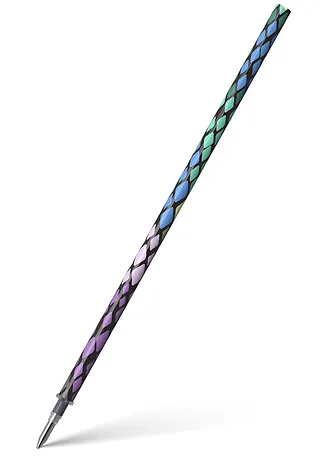 Красивый красочный стержень. В прозрачной ручке он смотрится свежо и оригинально. Очень привлекает внимание своим необычным рисунком. Рисунок на весь корпус, качественный, в виде кожи большой змеи, или просто геометрический узор, кому как больше нравится. Изображение на черном фоне, множество ромбов разнообразных цветов. Они зеленые разных оттенков, голубые, желтые, сиреневые, фиолетовые, коричневые. Все вместе они интересно смотрятся, контрастно, но выразительно.