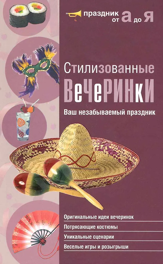 Оригинальные интересные сценарии стилизованных вечеринок, огромное количество конкурсов, игр и розыгрышей для любой компании, рекомендации по организации и проведению праздника, идеи ярких и красивых костюмов, кулинарные рецепты к любому застолью, секреты создания хорошего настроения у гостей...
