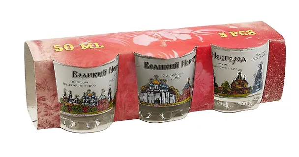 Стопки "Виды Великий Новгород" цветной рисунок, набор 3 штуки, красная упаковка