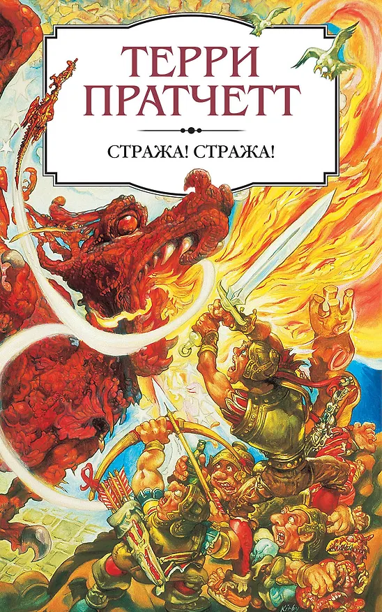 Первый и, по-моему, самый удачный роман из цикла Пратчетта о страже. Обложка Кирби очень забавная, и ее иронический дух отражает дух книги. Издание на достаточно приличной бумаге, плотной, буквы не просвечивают. Обложка с загнутыми внутрь краями, которые можно использовать как закладки.