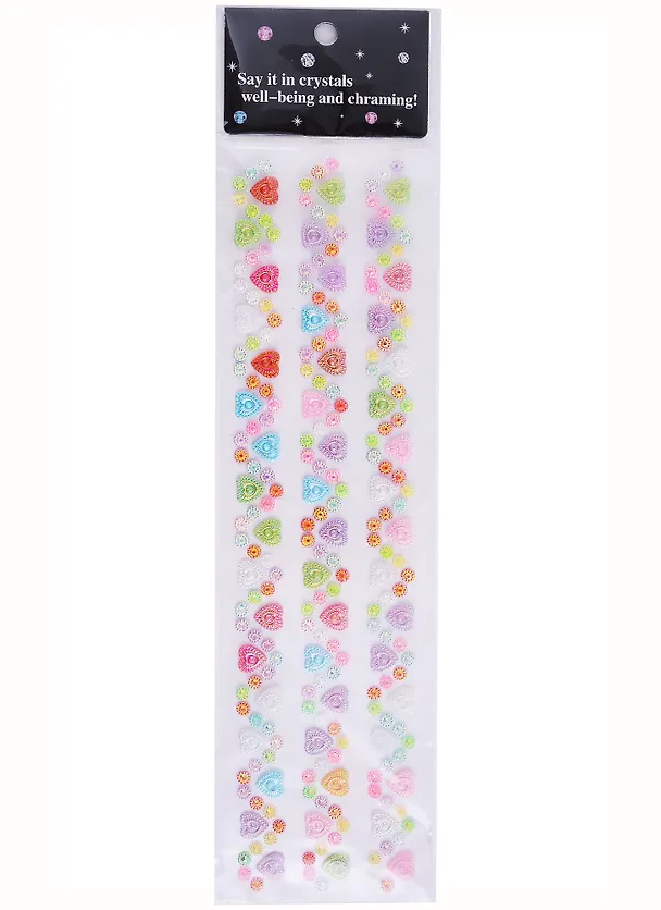 В наборе 7 полосок. На лицевой стороне разноцветный узор из мелких страз, на обратной есть липкая основа для крепления на бумагу, пластик и другие поверхности. Длина одной полоски — 35 см, ширина — 7 см.