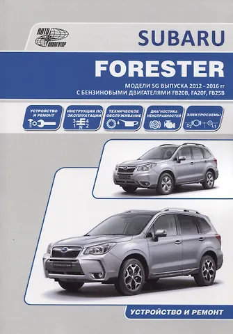 Книга по ремонту Субару Форестер 2012-2016 года выпуска, оборудованных бензиновыми двигателями FB20B, FA20F Turbo рабочим объемом 2,0 литра, а также бензиновыми двигателями FB25B рабочим объемом 2,5 литра. Руководство по ремонту Subaru Forester SG, инструкция по эксплуатации и техническому обслуживанию.