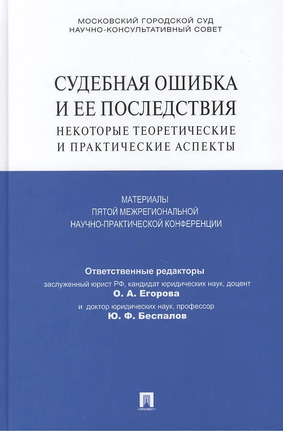 В данном научном издании публикуются доклады участников пятой межрегиональной научно-практической конференции, организованной и проведенной Московским городским судом и Научно-консультативным советом при Московском городском суде. Участниками конференции отмечалась актуальность темы, названы проблемы, связанные с судебными ошибками и их последствиями, был предложен комплекс мер по искоренению судебных ошибок: недопущению и устранению. В докладах указывалось на то, что Московский городской суд эффективно устраняет судебные ошибки судов г. Москвы, принимает меры по искоренению этого негативного явления. Сборник окажется полезным каждому, интересующемуся качеством судебной защиты и ее эффективн