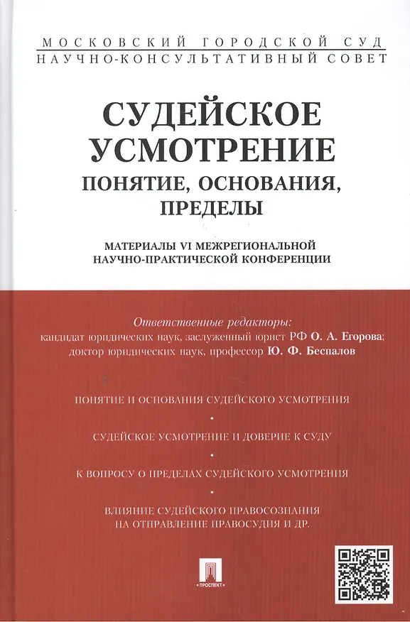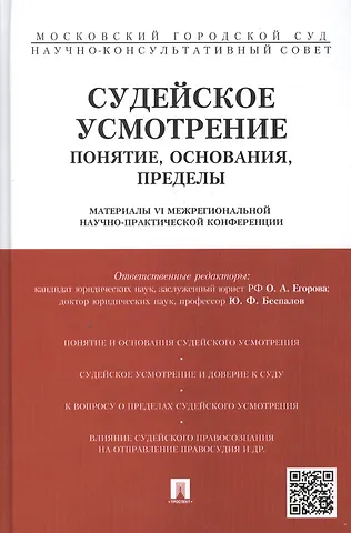 В данном научном издании публикуются доклады участников VI Межрегиональной научно-практической конференции, организованной и проведенной 4 декабря 2014 г. Московским городским судом и Научно-консультативным советом при Московском городском суде. Участниками конференции отмечалась актуальность темы, названы проблемы, связанные с судейским усмотрением, предложен комплекс мер по обеспечению законности, обоснованности и справедливости судейского усмотрения. В докладах указывалось на то, что Московский городской суд и Научно-консультативный совет ежегодно проводят комплекс мероприятий, направленных на повышение эффективности судейского усмотрения.