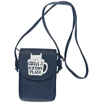 Небольшая сумочка на длинном ремне порадует любительниц кошек и ароматного кофе. Посмотрите, какой милый белый котёнок спрятался в кофейной чашке! Он охраняет сумочку, в которую вы можете положить телефон, записную книжку, ключи и пудреницу. Длину ремня вы можете отрегулировать под себя – просто перевяжите узелки.