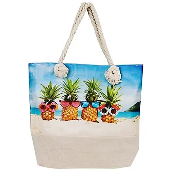Классная сумка для пляжа с ярким рисунком! Ткань плотная, не шуршит при носке и не оставляет зацепок, практически не мнется. Ананасики настраивают на позитивный лад) Сшита на 5+, стежки ровные, ниточки не торчат. Есть замочек и внутренняя подкладка.Ручки из плотного шнурка, крепкие, выдерживают все мои пляжные аксессуары, а еще выглядят эстетично и гармнонично. Во время носки не слетает с плеча и просто отличная вместительность!