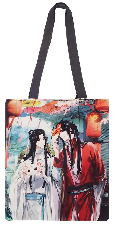 Так как мне нравится новелла Благословение Небожителей,то с удовольствием приобрела эту замечательную сумку для покупок. Рисунок Сё Ляня и Хуа Чена на ней яркий и красочный и радует глаз.Отмечу что сумка сделана из прочной ткани.Ткань внутри черная,что является плюсом так как на ней не видны пятна.Имеется и застёжка на молнии,что бы ничего не потерять