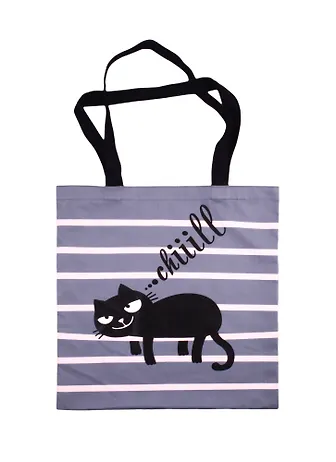 Сумка-шоппер Черный котик на полосках Chill (серая) (текстиль) (40х32/35) (СК2020-53)