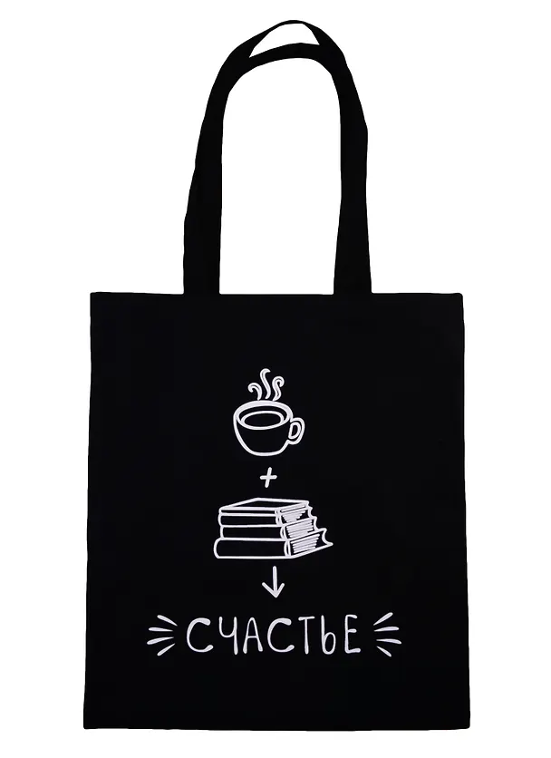 Сумка-шоппер Кофе, книги, счастье, черная, текстиль, 40см.*32см.