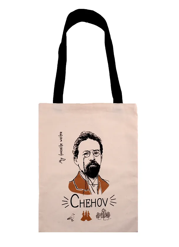Сумка очень красивая и стильная, в меру минималистичная и с культурной составляющей . Портрет писателя нанесен замечательно - рисунок четкий и детализированный, Чехов легко на нем узнается. Также очень здорово, что под портретом символические изображены три основные и любимые мной пьесы писателя, это придает сумке дополнительные шарм. Материал самой сумки очень прочный, за достаточно долгое время использования не порвался и не износился.