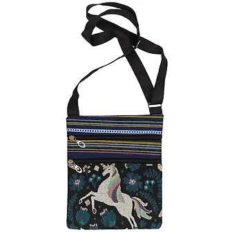 Наши сумки не из Франции, зато они порадуют любителей этнического стиля. На сумке выткан гарцующий единорог на цветочном поле, а верх сумки украшают разноцветные полоски.