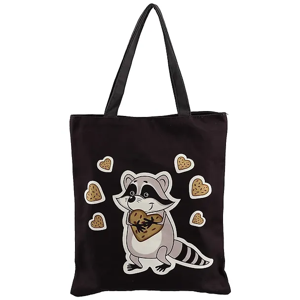 Хорошая сумка для похода в магазин. Сумка оптимальных размеров, вместительная, не маркая, ткань приятная на ощупь, очень интересный , весёлый рисунок в виде енота.  Сумка с подкладкой, есть не большой внутренней карман, сумка закрывается на замок молнию, что очень радует, ручки удобные не режут руки. Однако к ткани все липнет, что доставляет дополнительный уход за сумкой, надо чистить липким роликом, имеет неприятный запах при покупке.