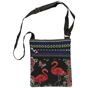 Наши сумки не из Франции, зато они порадуют любителей этнического стиля. На сумке вытканы яркие фламинго на цветочном поле, а верх сумки украшают разноцветные полоски.