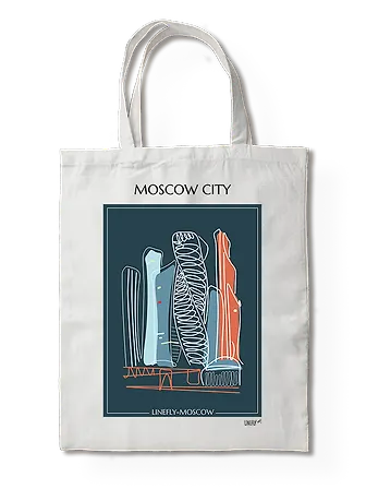 Шопер с лаконичным силуэтом «Москва-Сити» — это самый практичный и стильный сувенир, символ современной Москвы. Минималистичный дизайн в виде белой линии на темно-синем фоне легко впишется в любой гардероб, а удобный размер 35×40см позволит уместить все покупки в путешествии.